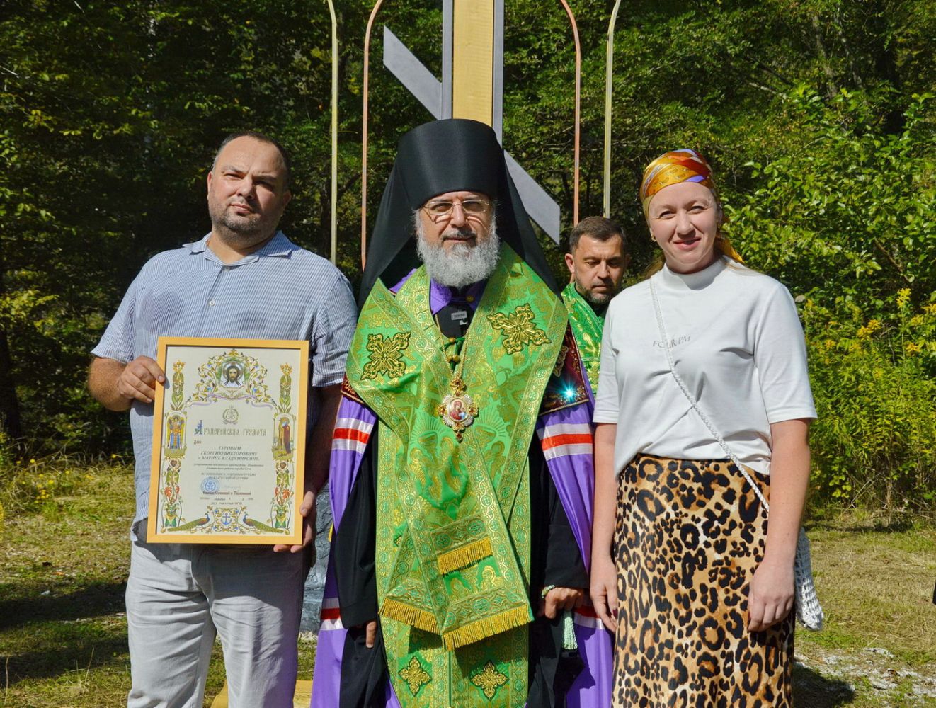 После освящения святыни супружеская чета Туровых- Георгий Викторович и Марина Владимировна- были удостоены Архиерейской грамоты за устроение Поклонного Креста.